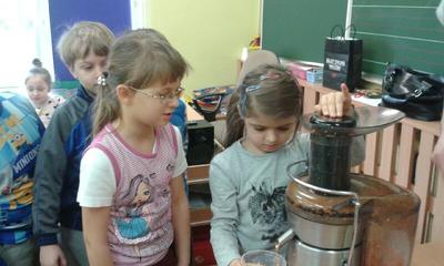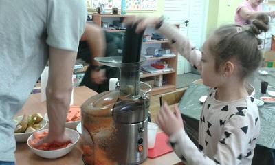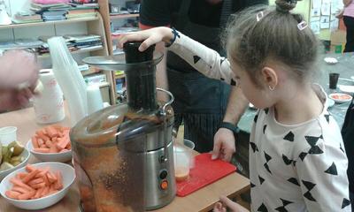 Z przywiezionych z restauracji produktów zrobiły pyszny sok owocowy a na deser same przygotowały sobie surówkę z warzyw i owoców.