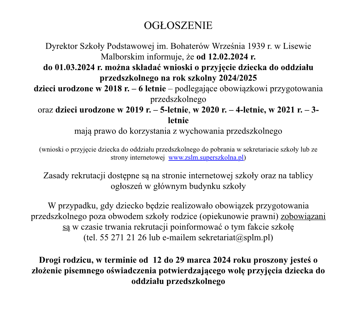 do odziału przedszkolnego oraz klasy pierwszej na rok szkolny 2024/2025.